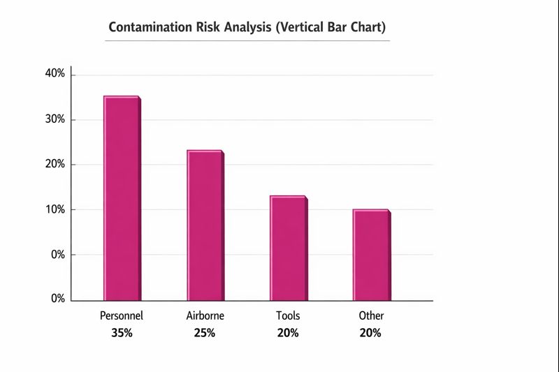Het verticale staafdiagram laat zien dat personeelsbewegingen het meest bijdragen aan kruisbesmetting in cleanrooms, waarbij de nadruk wordt gelegd op de juiste omgang met kleding en doekjes.