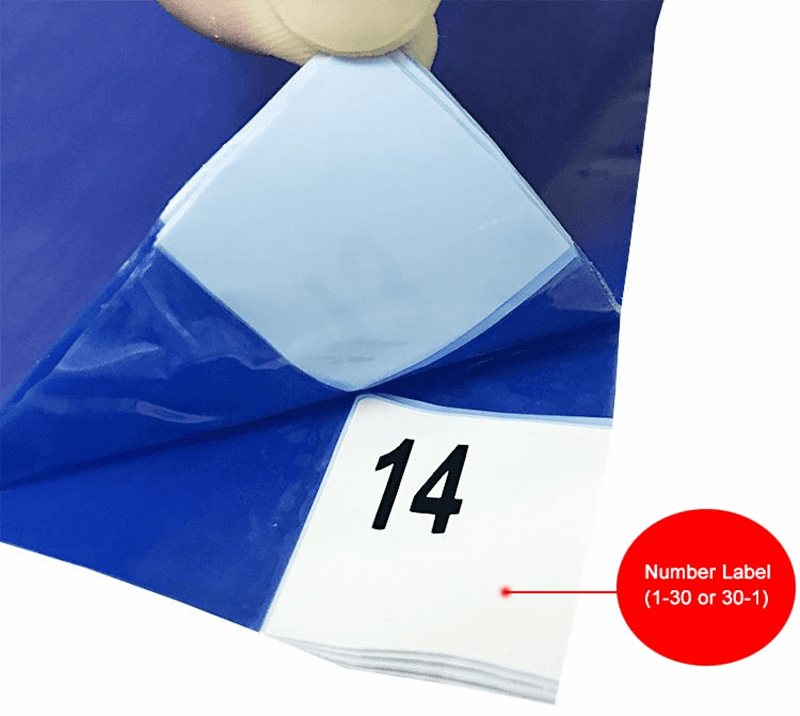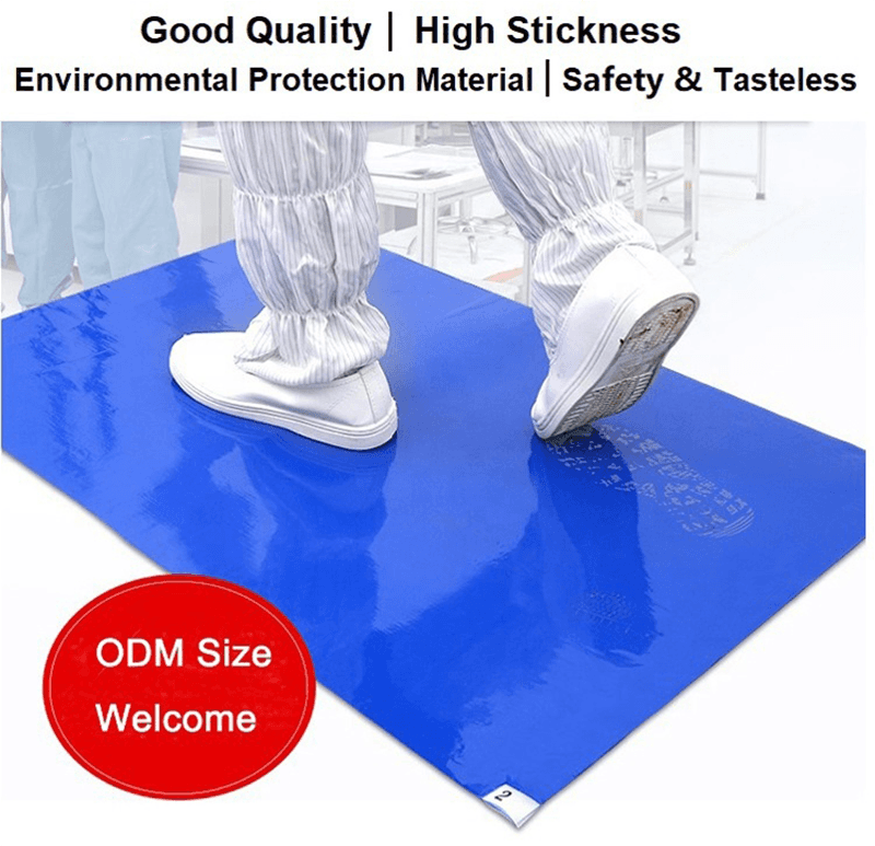 Efficiënte stofverwijdering: onze plakkerige matten zijn gemaakt van meerlagen lage dichtheid polyethyleen (PE) filmmateriaal, in totaal 30 lagen, en elke verwijderbare film is gelijkmatig gecoat met een coating met een hoge viscositeit. Elke laag heeft een consistente hechting, die stof, deeltjes en vuil op zolen, wielen en andere objecten effectief kan vangen, waardoor de overdracht van verontreinigende stoffen wordt geminimaliseerd.