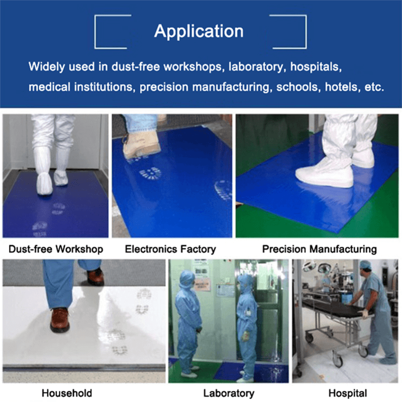 Gecontroleerde omgeving: of het nu gaat om elektronische productie, farmaceutische industrie of halfgeleiderproductie, plakkerige matten kunnen de overdracht van stof en deeltjes effectief verminderen en de kwaliteitscontrole van de productieomgeving verbeteren.